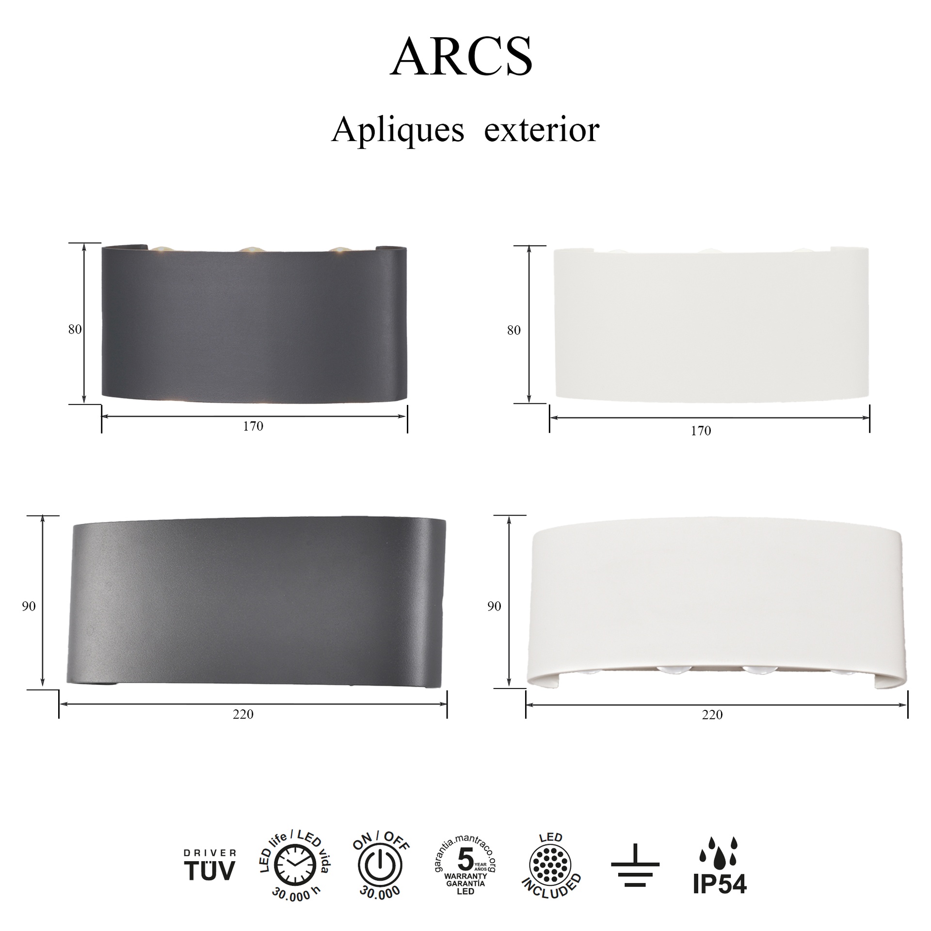 Avec le style défini par MANTRA TEAM, ARCS se présente comme une gamme d’éclairage extérieur polyvalente. Elle comprend des appliques murales d’extérieur offrant des solutions adaptables à différents espaces. Fabriqués en aluminium et en verre, ces luminaires sont disponibles en finitions blanc sable et gris foncé, alliant robustesse et style à chaque application. Ils intègrent la technologie LED avec des températures de couleur de 3000 K, garantissant confort et efficacité énergétique. Certifiés IP54, ils sont conçus pour une utilisation en extérieur et garantissent des performances stables même dans des conditions difficiles. ARCS est synonyme de design soigné et d’efficacité lumineuse pour tous types d’espaces.