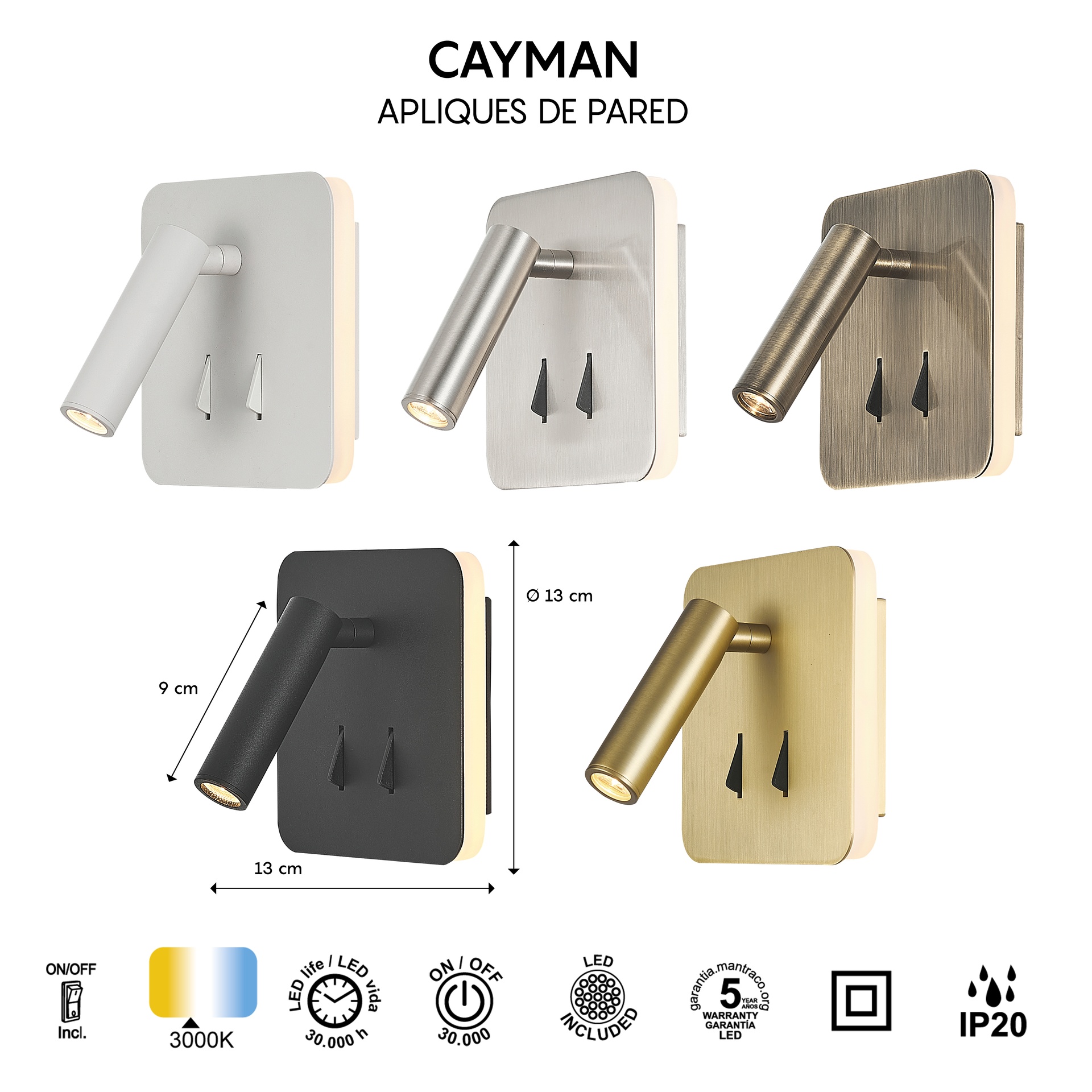 La famille CAYMAN, créée par MANTRA TEAM, apporte une vision innovante au monde de la technologie. Elle comprend des appliques murales offrant des solutions adaptables à différents espaces. Fabriquées en acrylique/blanc, fer/aluminium, ces luminaires sont disponibles en finitions blanc mat, cuir, noir mat, nickel satiné et or, offrant robustesse et style à chaque application. Elles intègrent la technologie LED avec des températures de couleur de 3000 K, garantissant confort et efficacité énergétique. Grâce à leur indice de protection IP20, elles sont idéales pour les intérieurs, garantissant durabilité et fiabilité. Une famille conçue pour répondre aussi bien aux environnements décoratifs qu’aux projets d’éclairage exigeants.