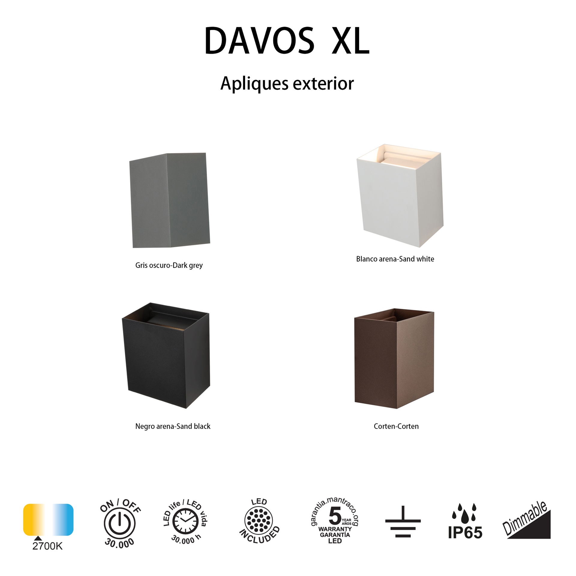 La famille DAVOS, créée par MANTRA TEAM, apporte une vision innovante à l’univers de l’éclairage extérieur. Elle comprend des appliques murales d’extérieur offrant des solutions adaptables à différents espaces. Fabriqués en aluminium, ces luminaires sont disponibles en finitions blanc sable, blanc, Corten, gris foncé, noir, noir sable et or, apportant robustesse et style à chaque application. Ils intègrent la technologie LED avec des températures de couleur de 2700K, 3000K et 4000K, garantissant confort et efficacité énergétique. Certifiés IP54 et IP65, ils sont conçus pour une utilisation en extérieur et garantissent des performances stables même dans des conditions difficiles. Une solution qui répond aux besoins des particuliers comme des professionnels de l’éclairage.