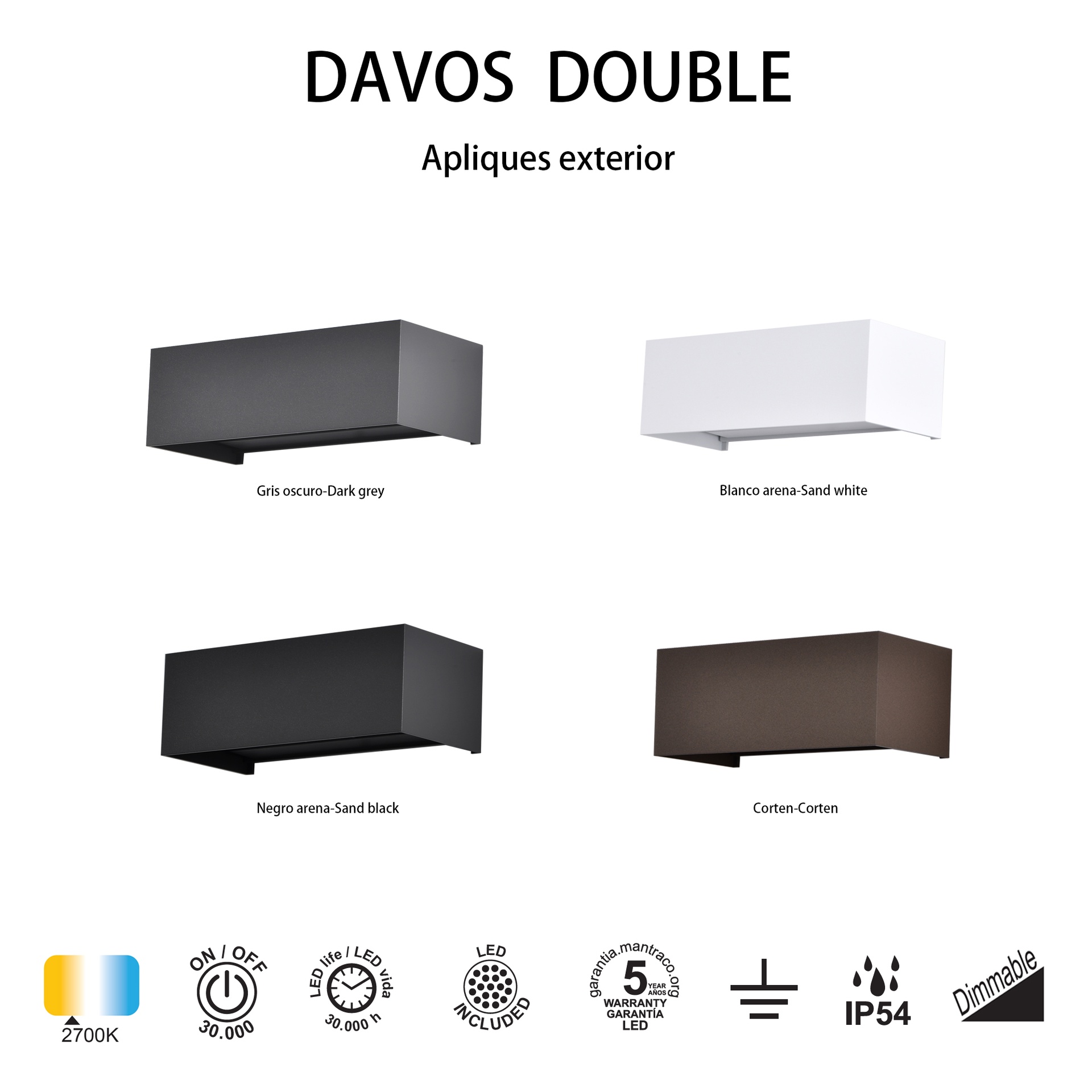 La famille DAVOS, créée par MANTRA TEAM, apporte une vision innovante à l’univers de l’éclairage extérieur. Elle comprend des appliques murales d’extérieur offrant des solutions adaptables à différents espaces. Fabriqués en aluminium, ces luminaires sont disponibles en finitions blanc sable, blanc, Corten, gris foncé, noir, noir sable et or, apportant robustesse et style à chaque application. Ils intègrent la technologie LED avec des températures de couleur de 2700K, 3000K et 4000K, garantissant confort et efficacité énergétique. Certifiés IP54 et IP65, ils sont conçus pour une utilisation en extérieur et garantissent des performances stables même dans des conditions difficiles. Une solution qui répond aux besoins des particuliers comme des professionnels de l’éclairage.