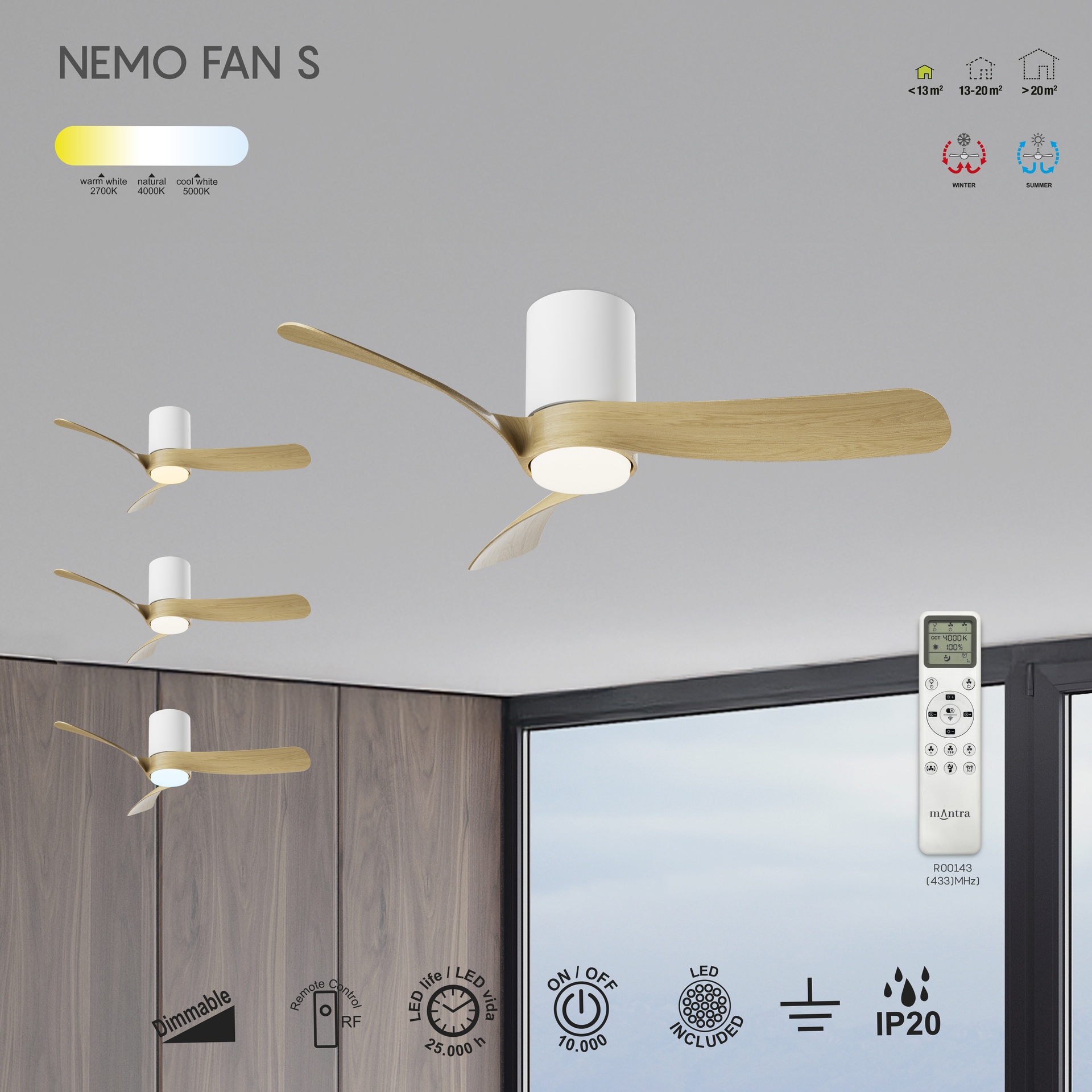 VENTILATEUR À LED MOYEN NEMO S* - BLANC/BOIS ****L****