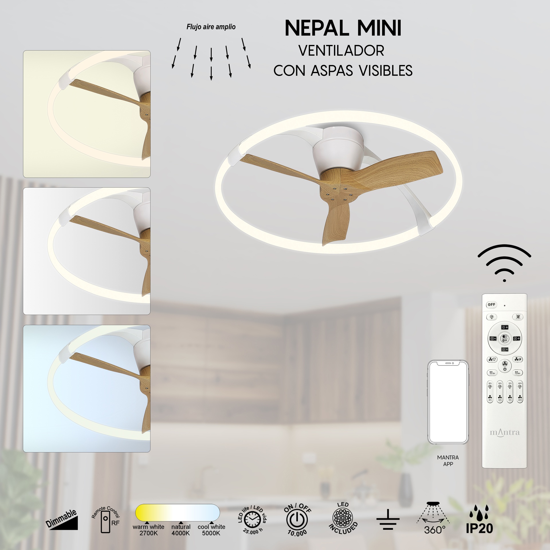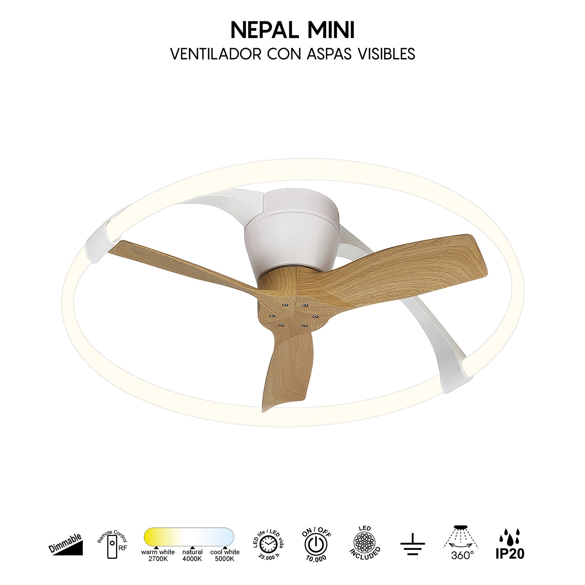Le design de NEPAL MINI, signé José Ignacio Ballester, allie créativité et précision en matière de ventilation. Ce ventilateur de plafond offre des solutions adaptables à différents espaces. Fabriqués en acrylique/blanc, diffuseur/acrylique, les luminaires sont disponibles en blanc, blanc/bois ou noir, offrant robustesse et style à chaque application. Ils intègrent la technologie LED avec des températures de couleur de 2700K à 5000K, garantissant confort et efficacité énergétique. Grâce à leur indice de protection IP20, ils sont parfaits pour les intérieurs, garantissant durabilité et fiabilité. Une solution qui répond aux besoins des particuliers comme des professionnels de l’éclairage.