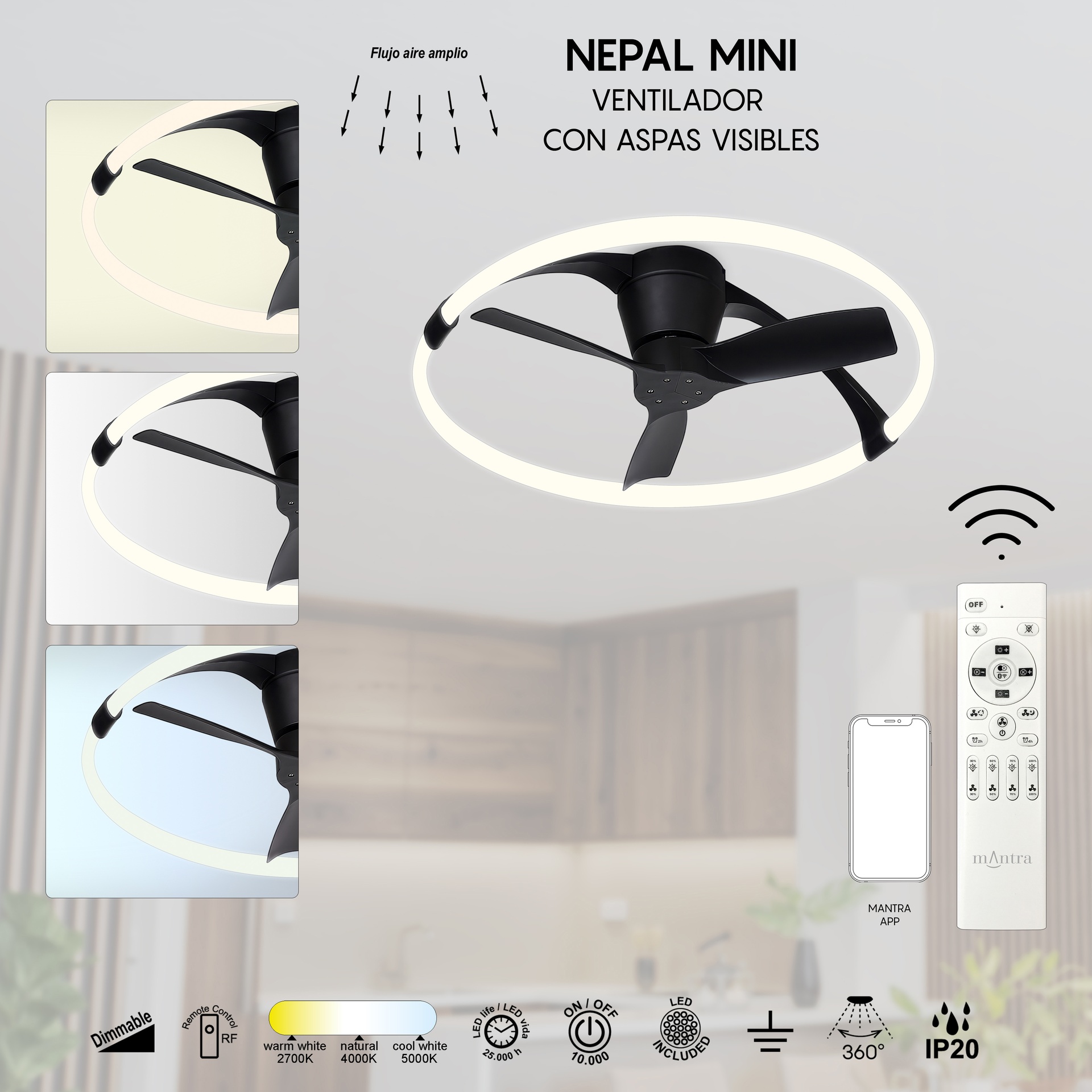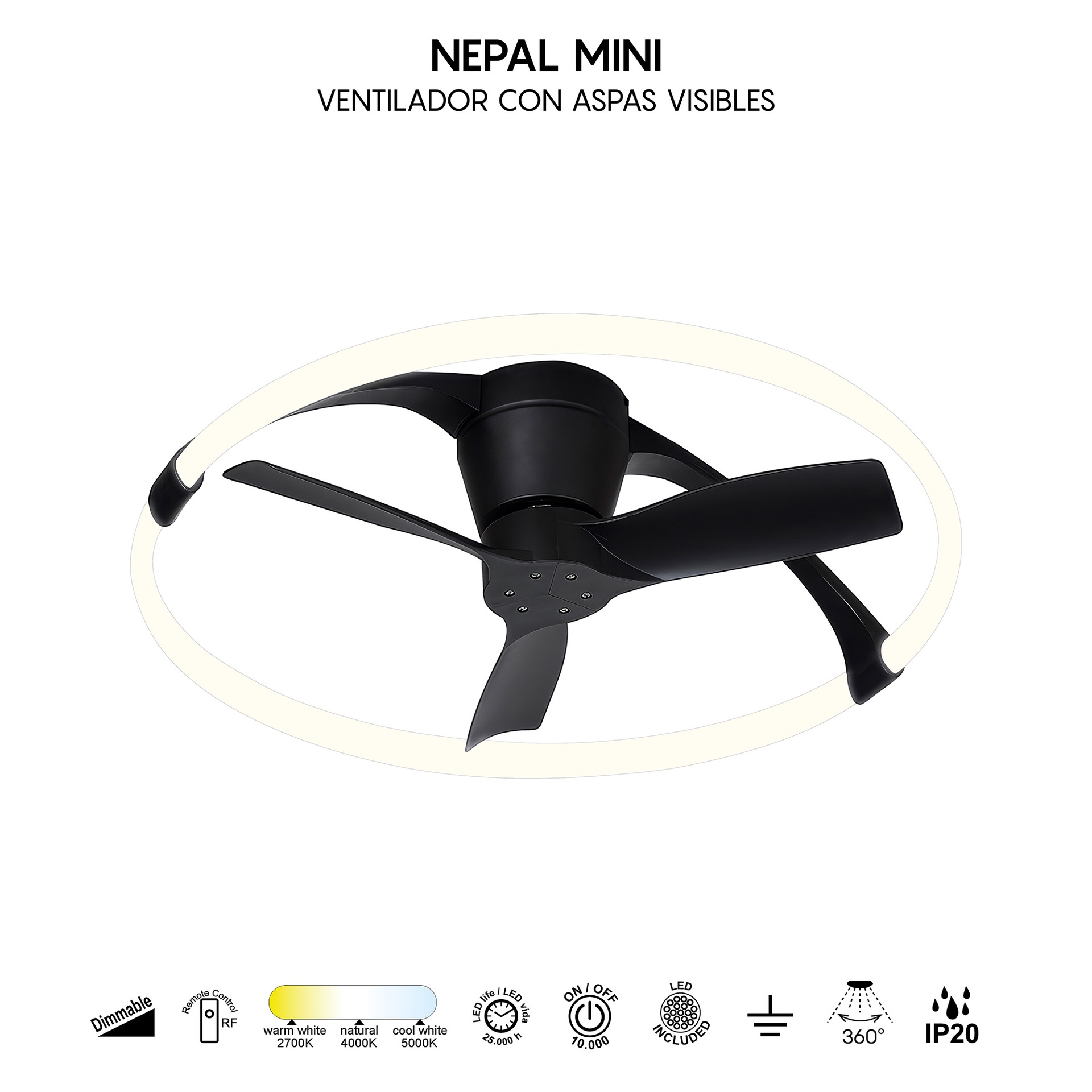 Le design de NEPAL MINI, signé José Ignacio Ballester, allie créativité et précision en matière de ventilation. Ce ventilateur de plafond offre des solutions adaptables à différents espaces. Fabriqués en acrylique/blanc, diffuseur/acrylique, les luminaires sont disponibles en blanc, blanc/bois ou noir, offrant robustesse et style à chaque application. Ils intègrent la technologie LED avec des températures de couleur de 2700K à 5000K, garantissant confort et efficacité énergétique. Grâce à leur indice de protection IP20, ils sont parfaits pour les intérieurs, garantissant durabilité et fiabilité. Une solution qui répond aux besoins des particuliers comme des professionnels de l’éclairage.