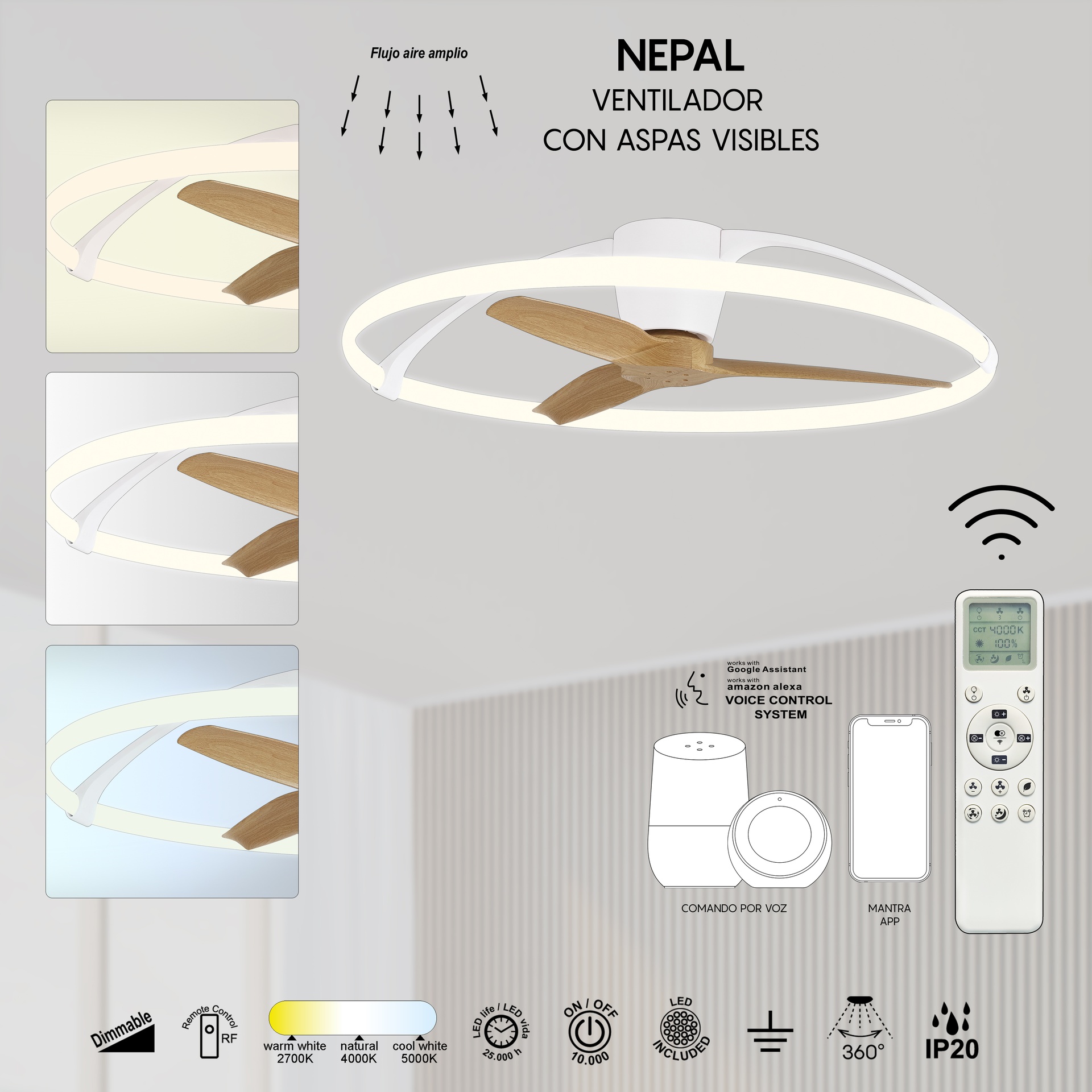 La collection NEPAL, conçue par José Ignacio Ballester, est une offre unique dans le secteur de la ventilation, se distinguant par sa personnalité et son caractère distinctif. Composée d’un ventilateur de plafond, elle offre des solutions adaptables à différents espaces. Les luminaires sont dotés d’un diffuseur en acrylique et disponibles en finitions blanc, blanc/bois, noir ou argent/noyer, offrant robustesse et style à chaque application. Ils intègrent la technologie LED avec des températures de couleur de 2700K à 5000K, garantissant confort et efficacité énergétique. Grâce à leur indice de protection IP20, ils sont parfaits pour les intérieurs, garantissant durabilité et fiabilité. NEPAL est synonyme de design soigné et d’efficacité lumineuse pour tous types d’espaces.