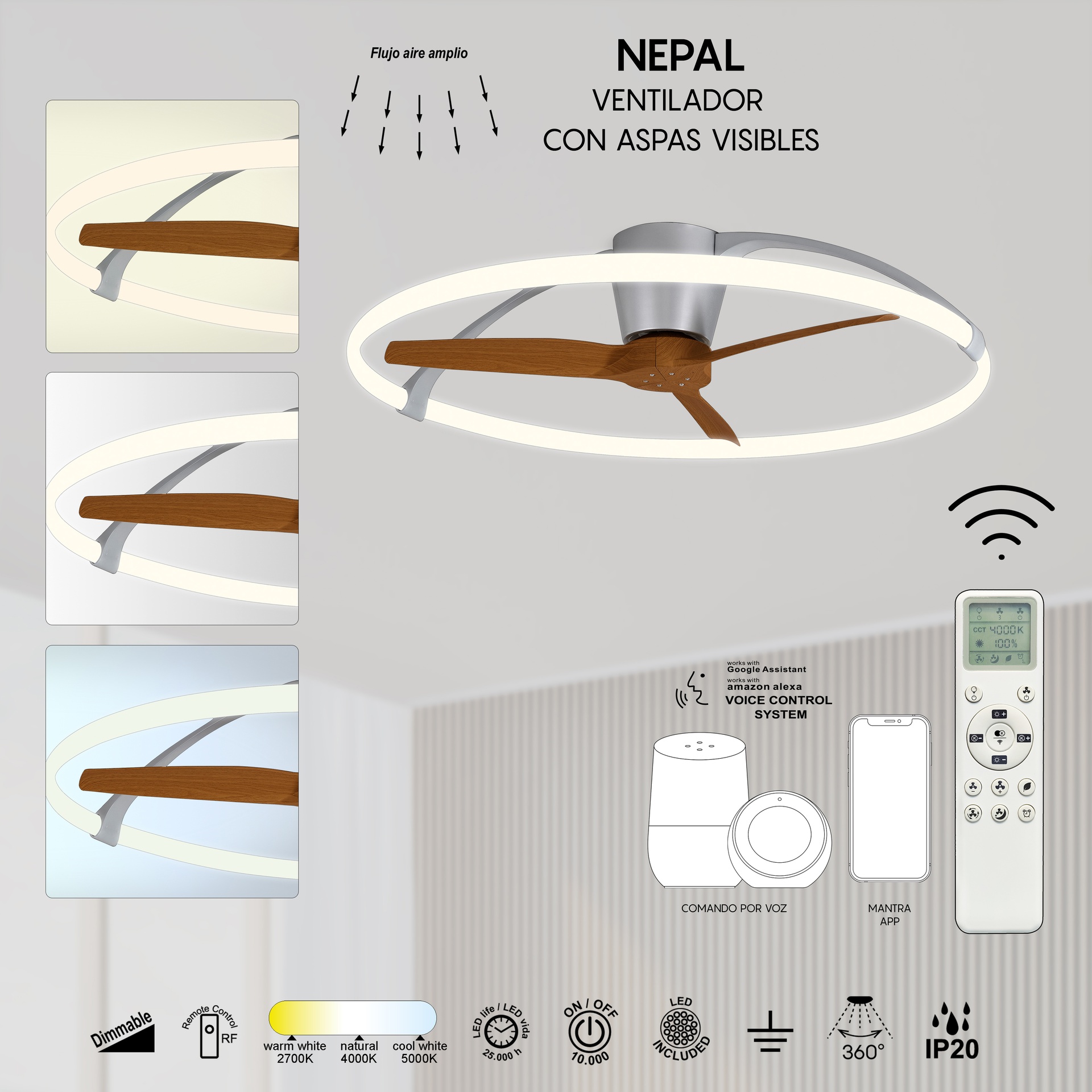 La collection NEPAL, conçue par José Ignacio Ballester, est une offre unique dans le secteur de la ventilation, se distinguant par sa personnalité et son caractère distinctif. Composée d’un ventilateur de plafond, elle offre des solutions adaptables à différents espaces. Les luminaires sont dotés d’un diffuseur en acrylique et disponibles en finitions blanc, blanc/bois, noir ou argent/noyer, offrant robustesse et style à chaque application. Ils intègrent la technologie LED avec des températures de couleur de 2700K à 5000K, garantissant confort et efficacité énergétique. Grâce à leur indice de protection IP20, ils sont parfaits pour les intérieurs, garantissant durabilité et fiabilité. NEPAL est synonyme de design soigné et d’efficacité lumineuse pour tous types d’espaces.