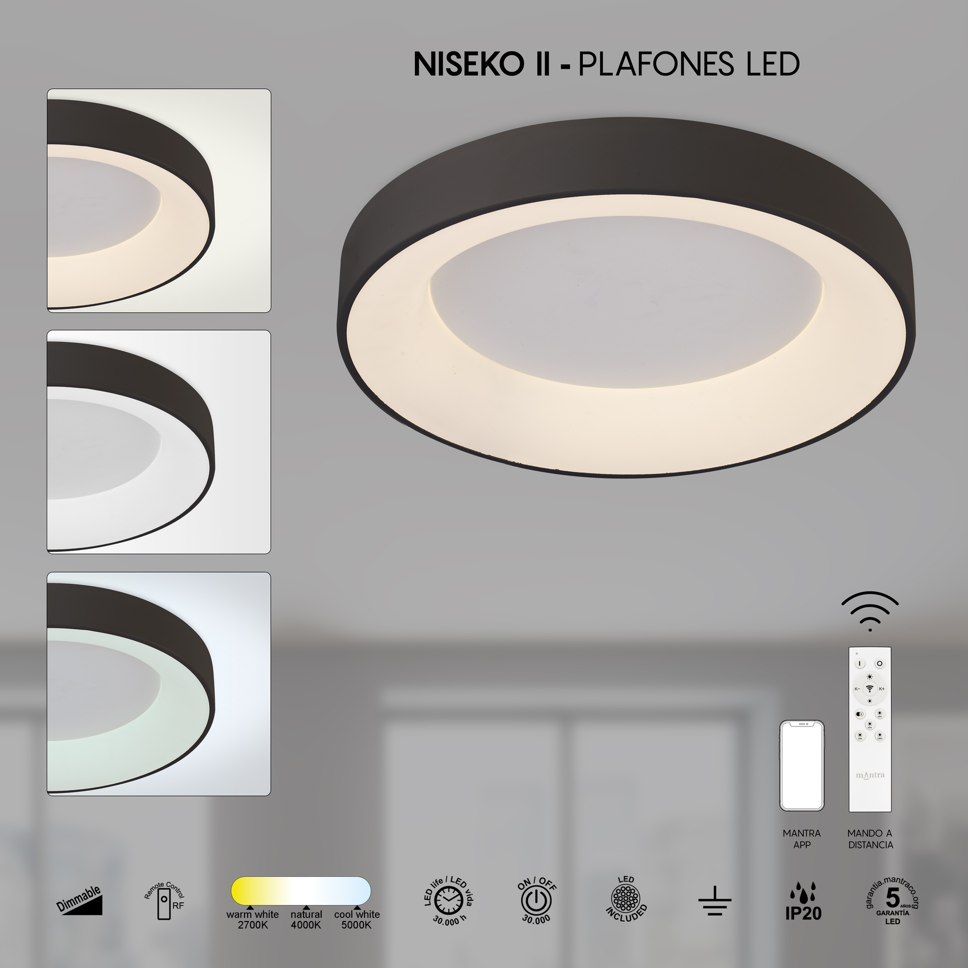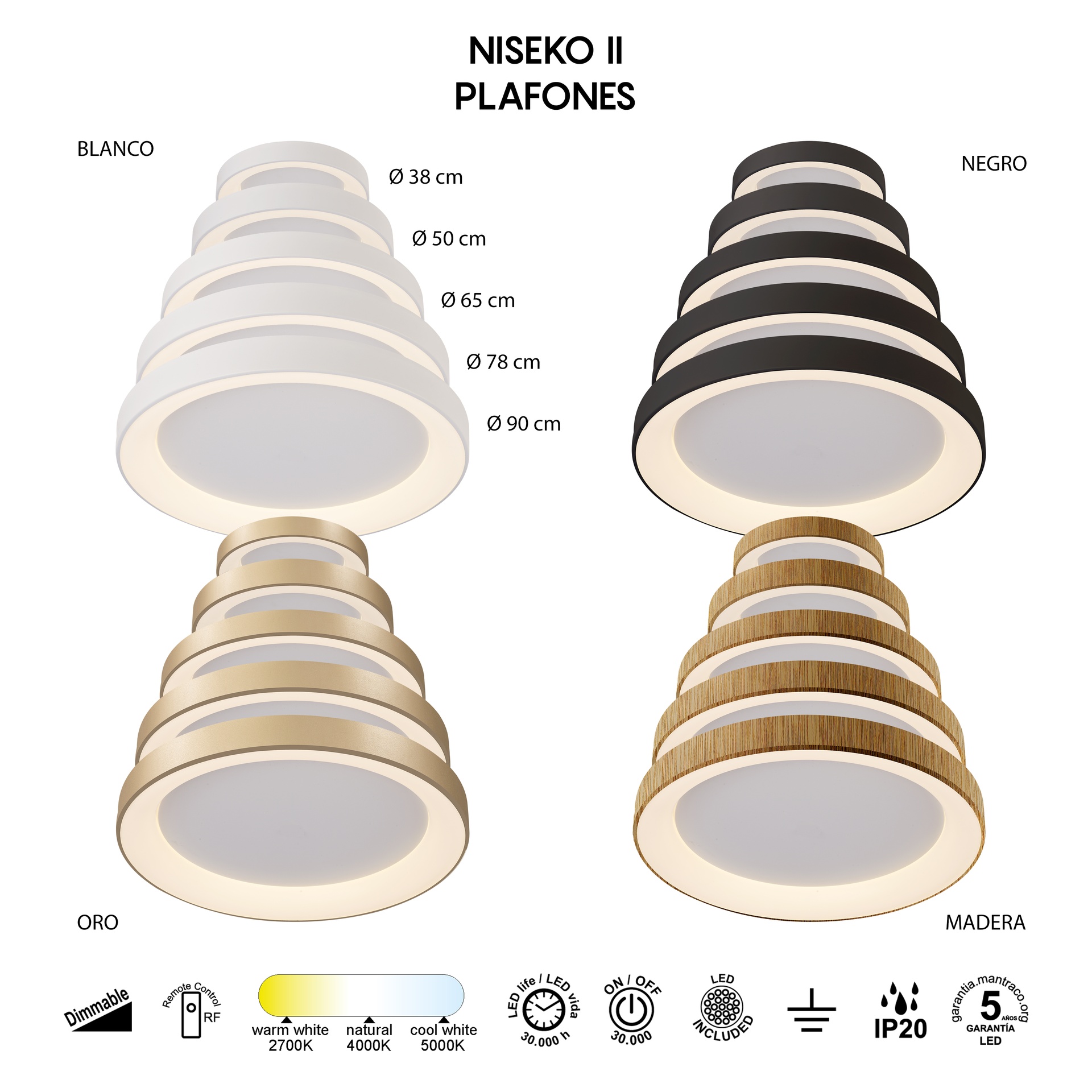 Avec le style défini par MANTRA TEAM, NISEKO II propose une gamme polyvalente pour la décoration intérieure. Elle comprend des plafonniers et des suspensions, offrant des solutions adaptables à différents espaces. Fabriqués en acier/acrylique, acrylique/blanc, les luminaires sont disponibles en blanc, bois, noir ou or, alliant robustesse et style à chaque application. Ils intègrent la technologie LED avec des températures de couleur de 2700K à 5000K, garantissant confort et efficacité énergétique. Grâce à leur indice de protection IP20, ils sont parfaits pour les intérieurs, garantissant durabilité et fiabilité. NISEKO II est synonyme de design soigné et d’efficacité lumineuse pour tous types d’espaces.
