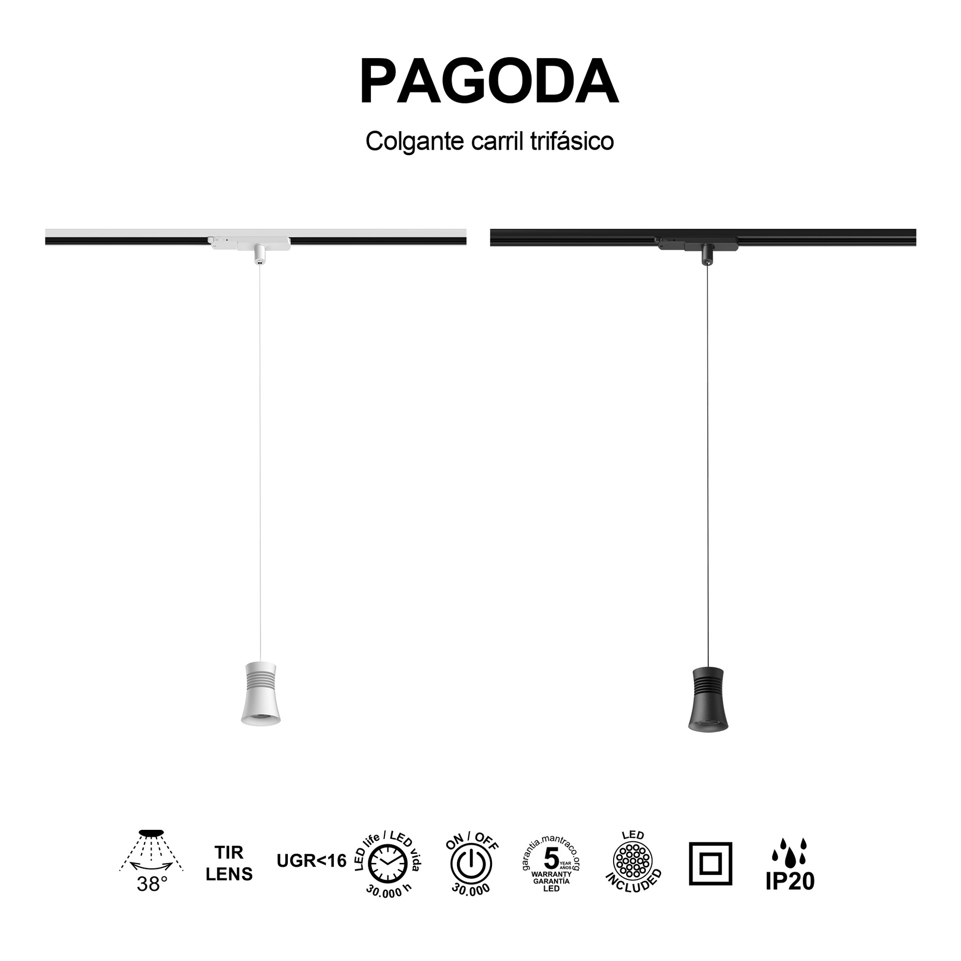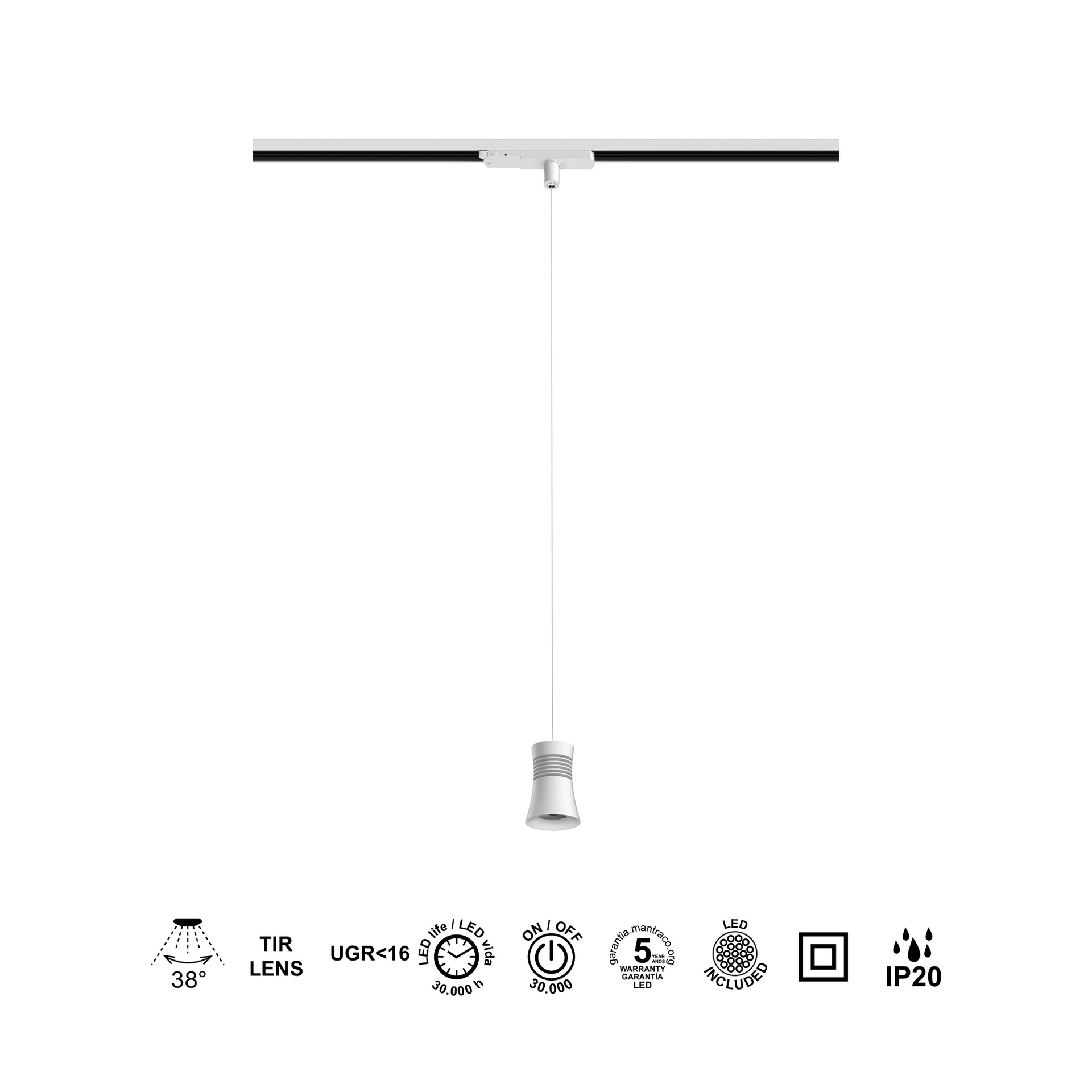 PAGODA * SUSPENSION LED TRIPHASÉ SUR RAIL 12,5W 3000K BLANC