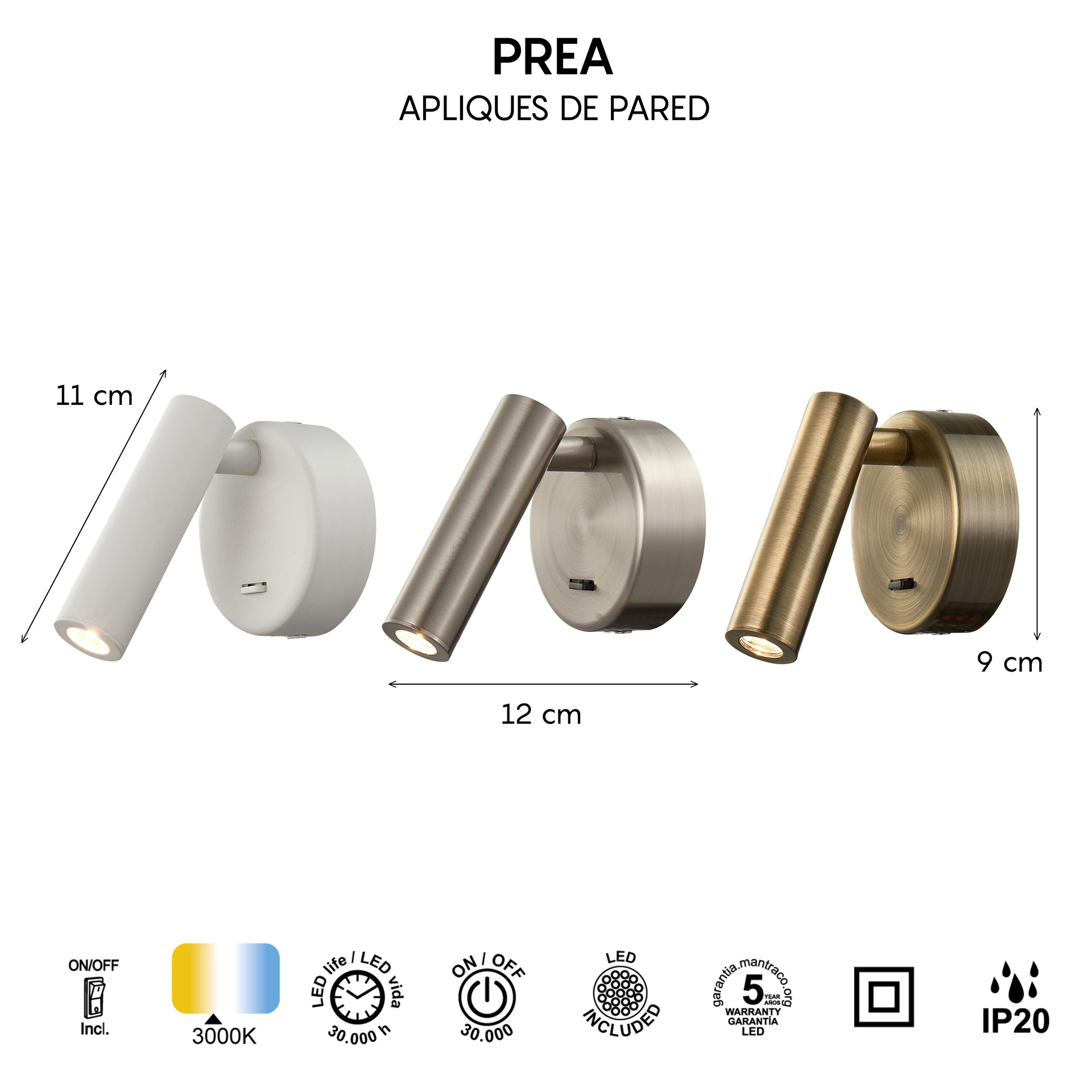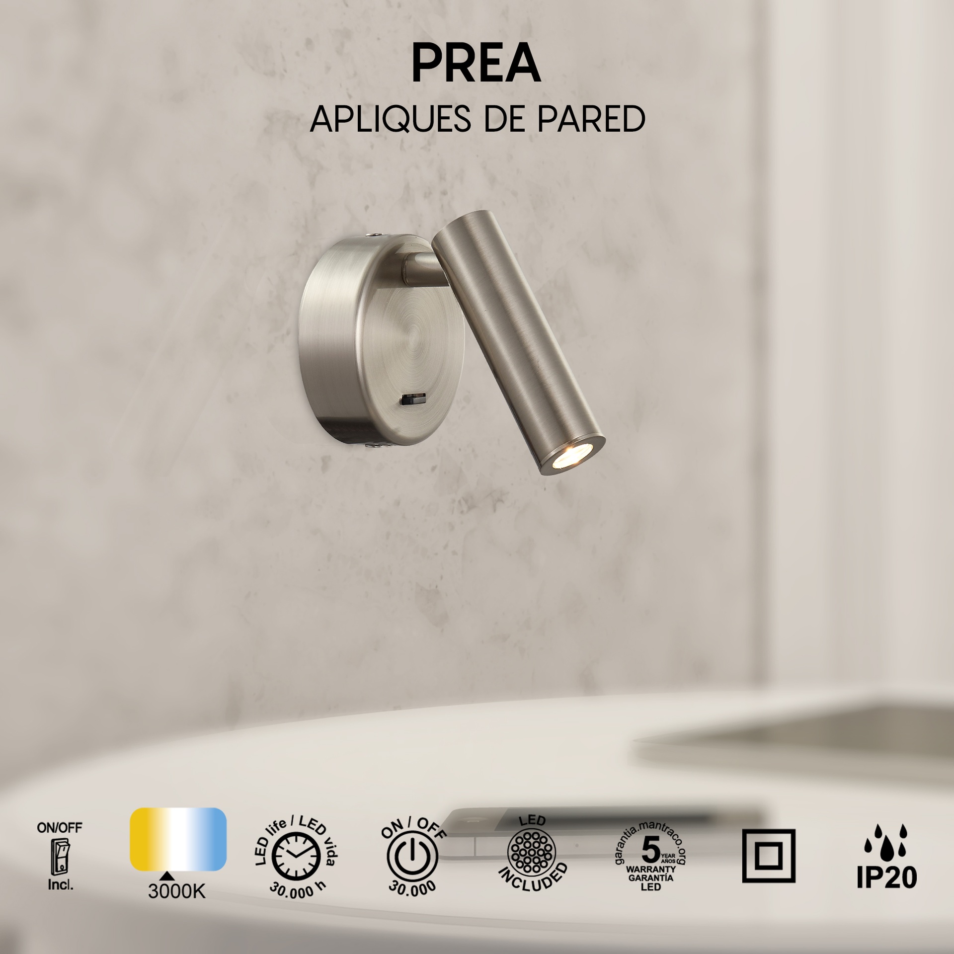 La famille PREA, créée par MANTRA TEAM, apporte une vision innovante au monde de la technologie. Elle comprend des appliques murales offrant des solutions adaptables à différents espaces. Fabriquées en aluminium, fer/aluminium et disponibles en finitions blanc mat, cuir, noir ou nickel satiné, ces luminaires allient robustesse et style à toutes les applications. Elles intègrent la technologie LED avec des températures de couleur de 3000 K, garantissant confort et efficacité énergétique. Grâce à leur indice de protection IP20, elles sont idéales pour les intérieurs, garantissant durabilité et fiabilité. Une proposition qui répond aux besoins des particuliers comme des professionnels de l’éclairage.