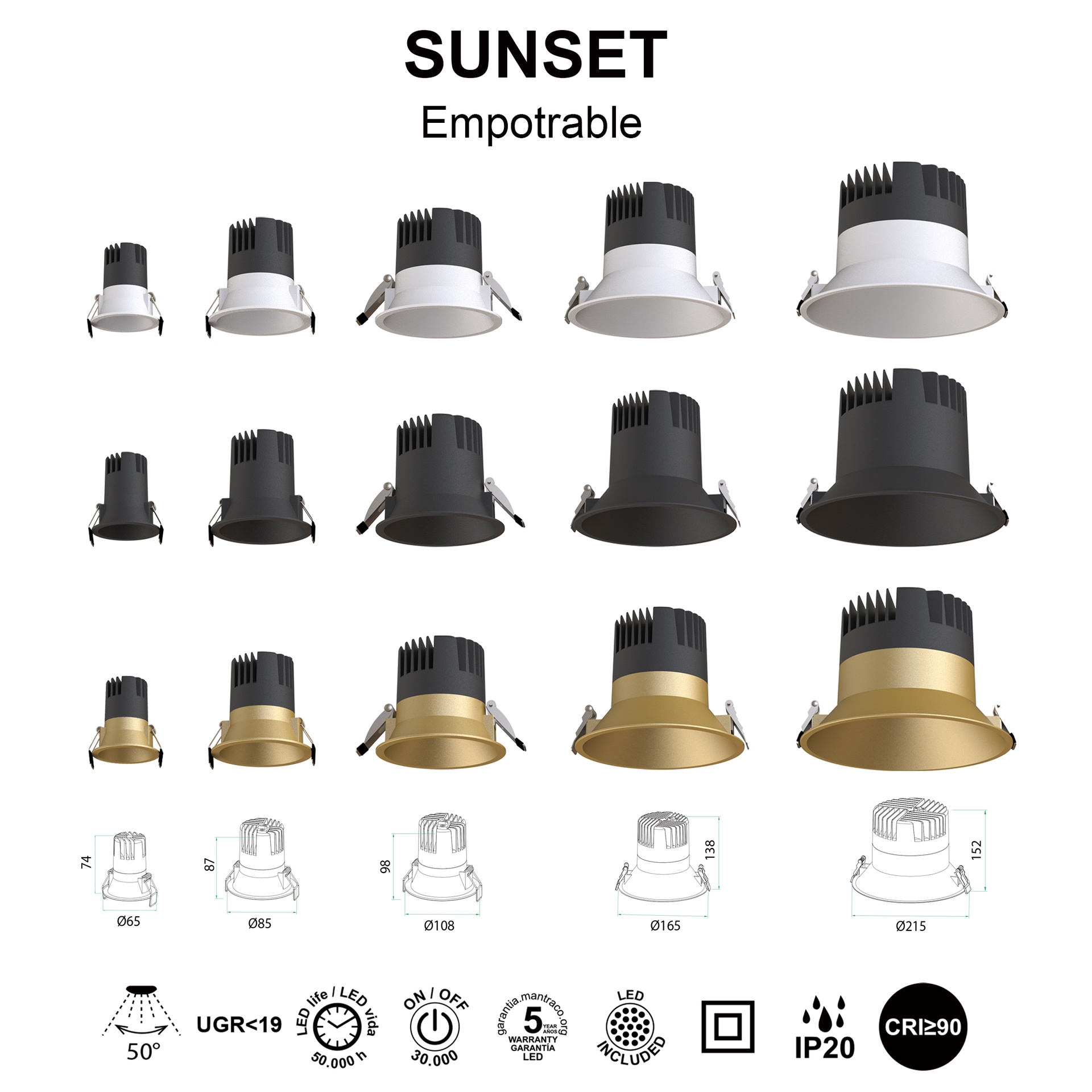 Le design de SUNSET, œuvre de MANTRA TEAM, allie créativité et précision technique. Il se compose d’encastrés/downlights, offrant des solutions adaptables à différents espaces. Fabriqués en aluminium, plastique et aluminium, les luminaires sont disponibles en blanc, noir ou doré, alliant robustesse et style à chaque application. Ils intègrent la technologie LED avec des températures de couleur de 2700K, 3000K et 4000K, garantissant confort et efficacité énergétique. Grâce à leur indice de protection IP20, ils sont parfaits pour les intérieurs, garantissant durabilité et fiabilité. SUNSET est synonyme de design soigné et d’efficacité lumineuse pour tous types d’espaces.