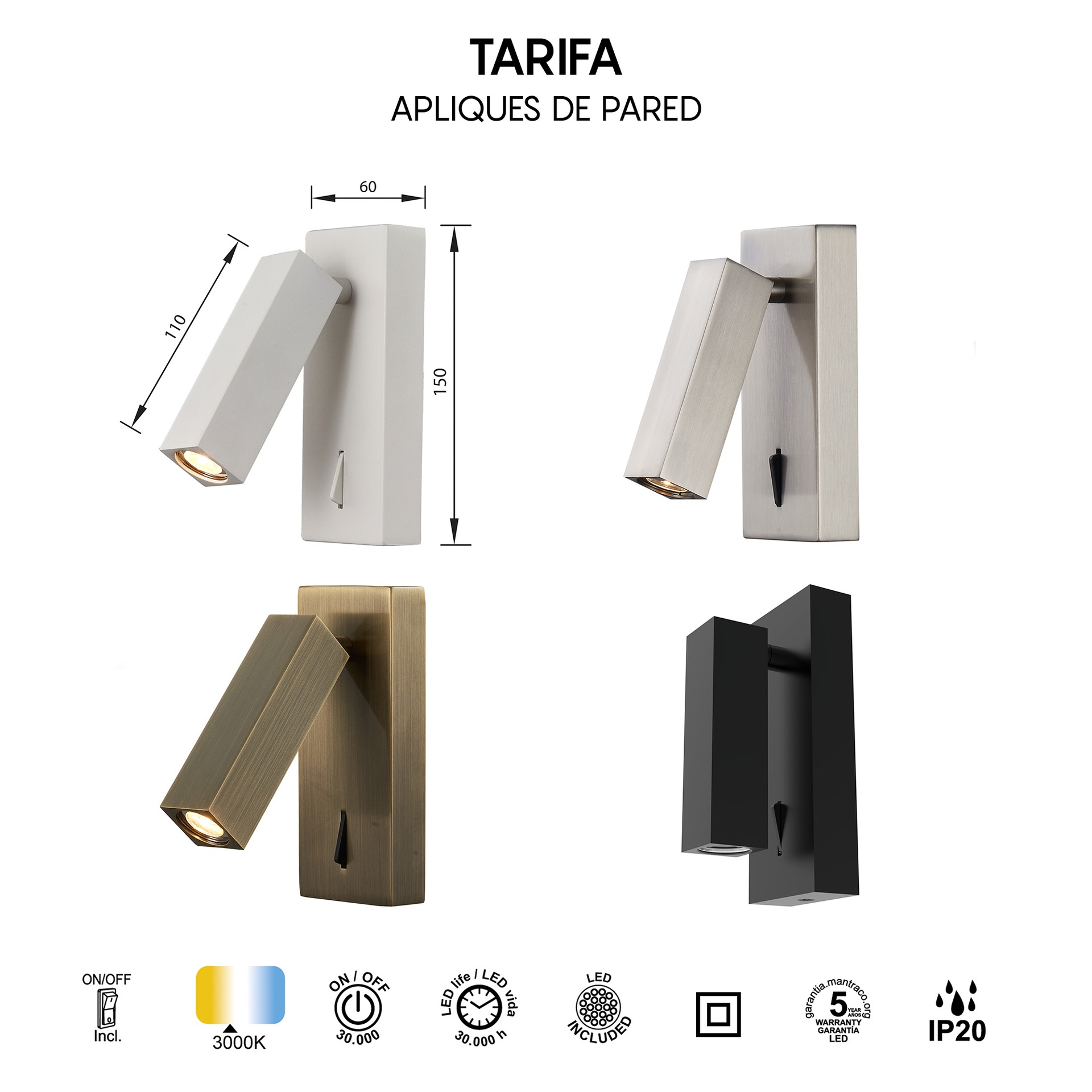 TARIFA, conçue par MANTRA TEAM, propose une interprétation contemporaine et technique de la technologie tek. Elle comprend des appliques murales offrant des solutions adaptables à différents espaces. Fabriquées en fer et en aluminium, ces luminaires sont disponibles en finitions blanc mat, cuir ou nickel satiné, alliant robustesse et style à chaque application. Elles intègrent la technologie LED avec des températures de couleur de 3000 K, garantissant confort et efficacité énergétique. Grâce à leur indice de protection IP20, elles sont idéales pour les intérieurs, garantissant durabilité et fiabilité. TARIFA reflète l’équilibre entre esthétique soignée et performances techniques de haut niveau.