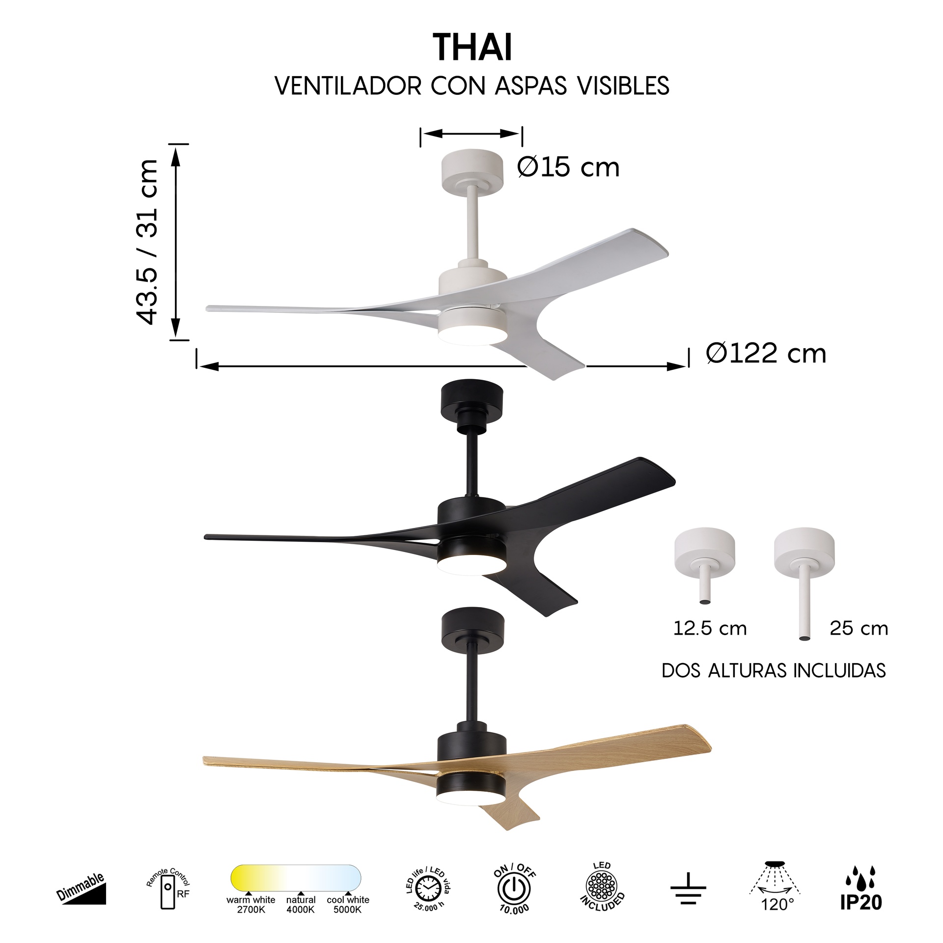 Le design THAI, signé NACHO TIMON, allie créativité et précision en matière de ventilation. Ce ventilateur de plafond offre des solutions adaptables à différents espaces. Fabriqués en acier/ABS et disponibles en finitions blanc, noir ou noir/bois, les luminaires allient robustesse et style à chaque application. Ils intègrent la technologie LED avec des températures de couleur de 2700K à 5000K, garantissant confort et efficacité énergétique. Grâce à leur indice de protection IP20, ils sont parfaits pour les intérieurs, garantissant durabilité et fiabilité. Une gamme conçue pour répondre aussi bien aux environnements décoratifs qu’aux projets d’éclairage exigeants.