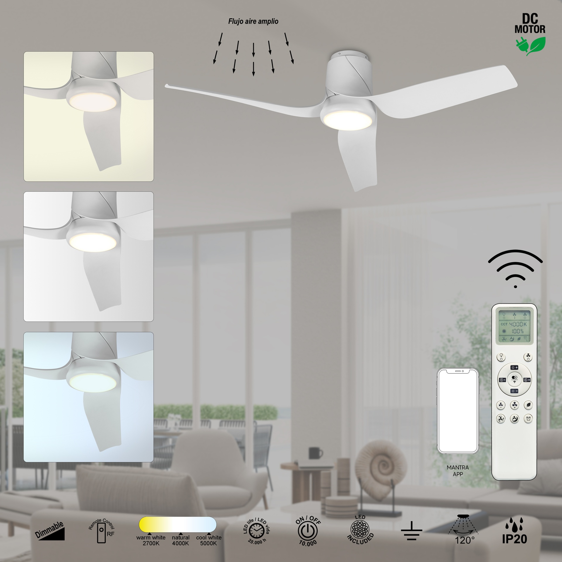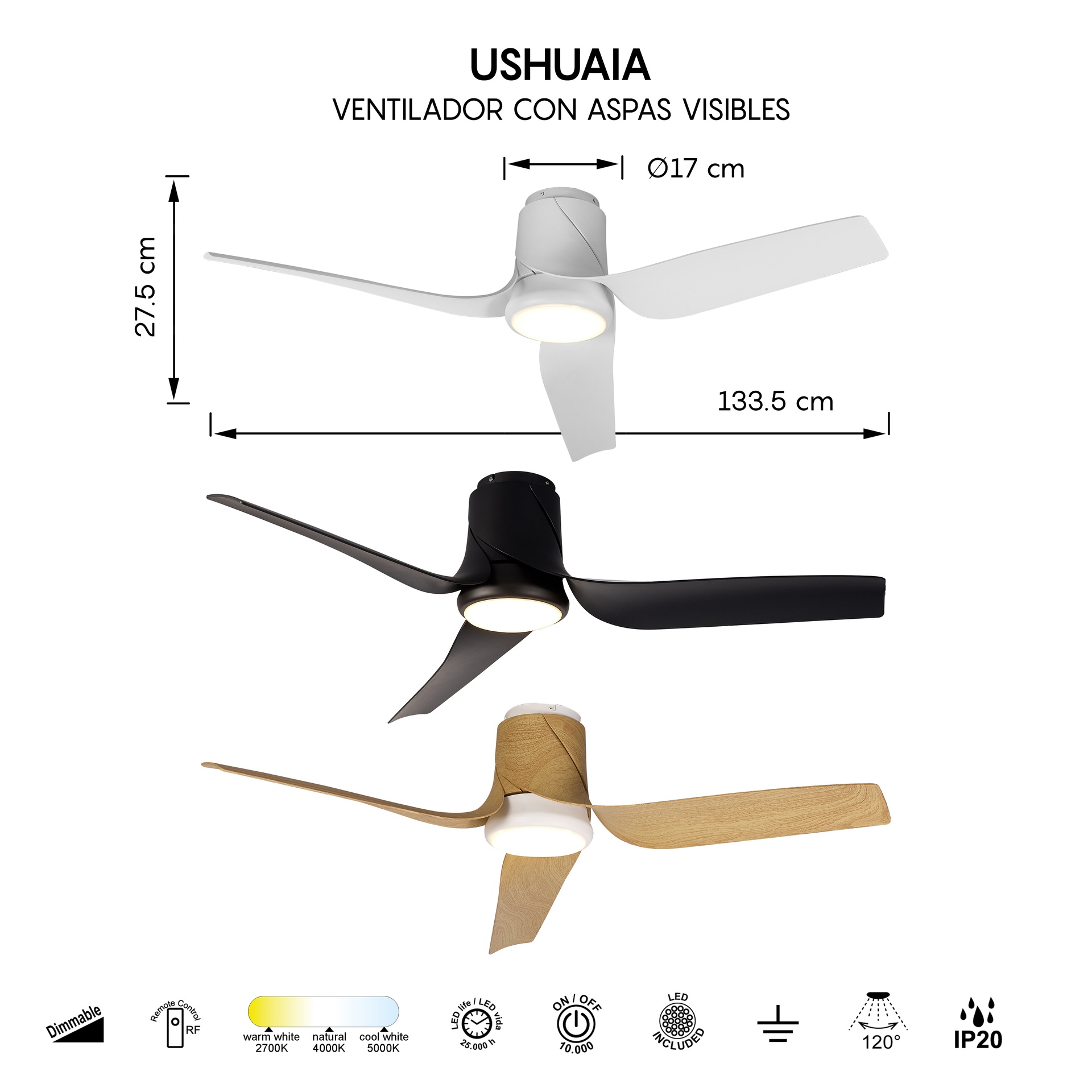 USHUAIA, conçu par NACHO TIMON, propose une interprétation contemporaine et technique de la ventilation. Ce ventilateur de plafond offre des solutions adaptables à différents espaces. Fabriqués en acier/ABS et disponibles en blanc, bois ou noir, les luminaires allient robustesse et style à chaque application. Ils intègrent la technologie LED avec des températures de couleur de 2700K à 5000K, garantissant confort et efficacité énergétique. Grâce à leur indice de protection IP20, ils sont parfaits pour les intérieurs, garantissant durabilité et fiabilité. Cette famille a été créée pour répondre aussi bien aux environnements décoratifs qu’aux projets d’éclairage exigeants.