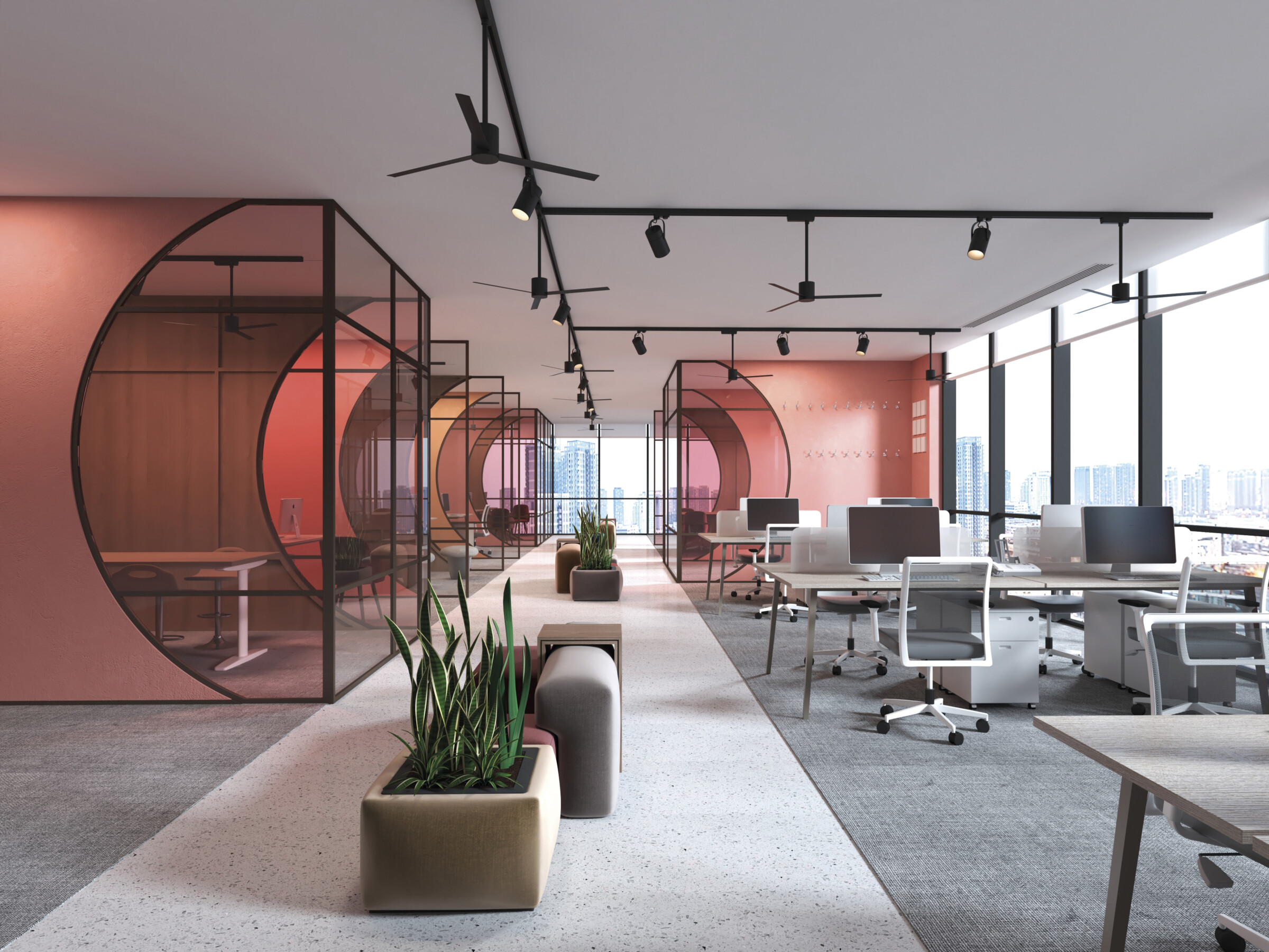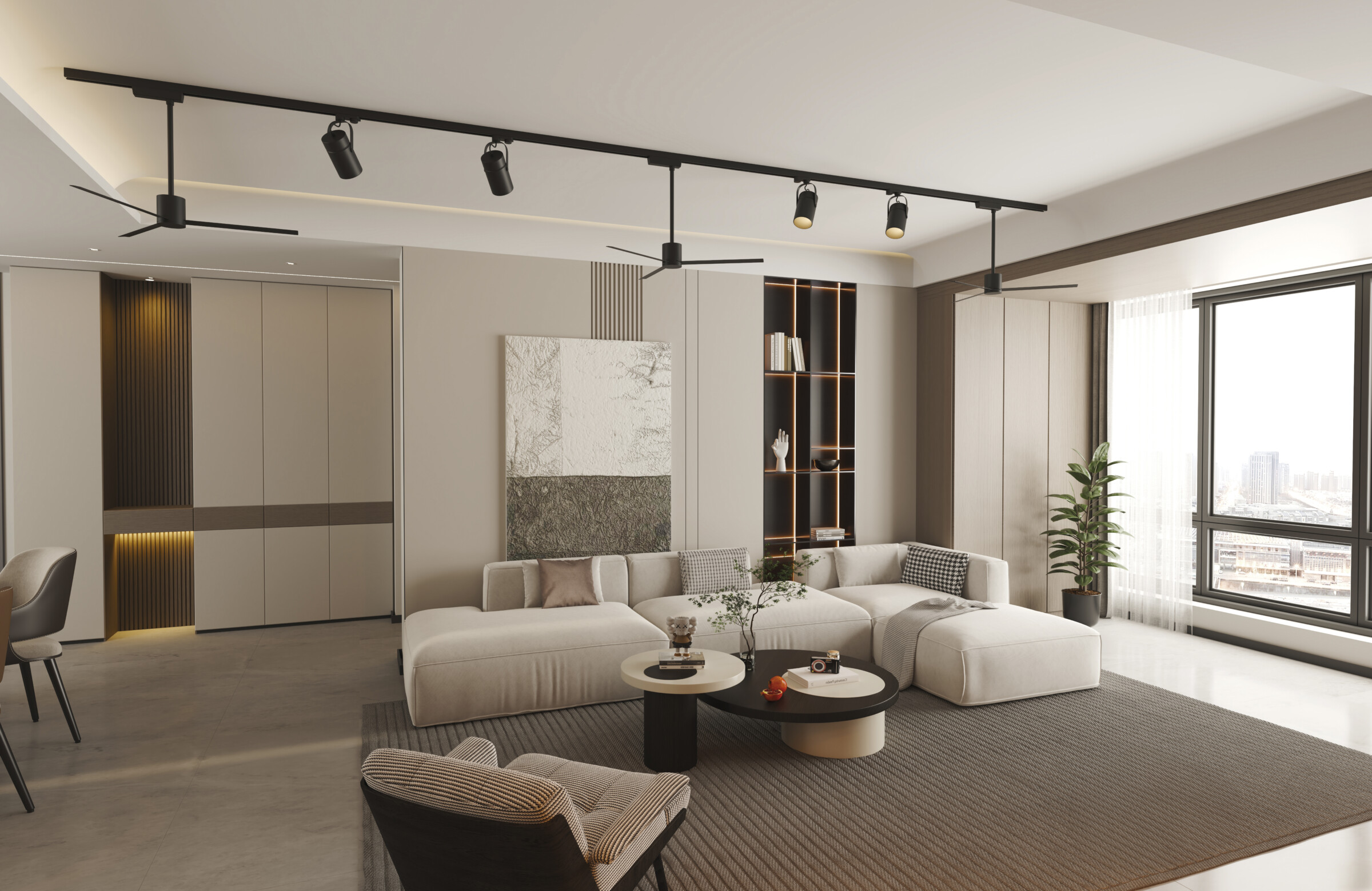 1. Ventilateur de plafond avec lumière et pales toroïdales : Conçu pour assurer une circulation d’air efficace avec un aspect élégant et moderne.